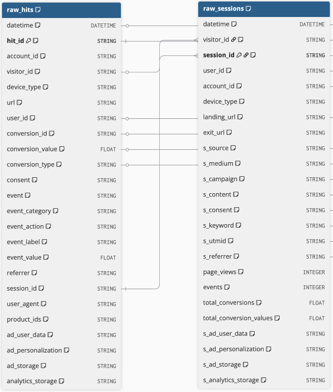 A user (identified by a user_id) can have several devices, and therefore several browsers (identified by several visitors_id). They can have multiple sessions (identified by multiple session_id) during which they navigate from page to page and record multiple events, event and page_view (identified by multiple hit_id).